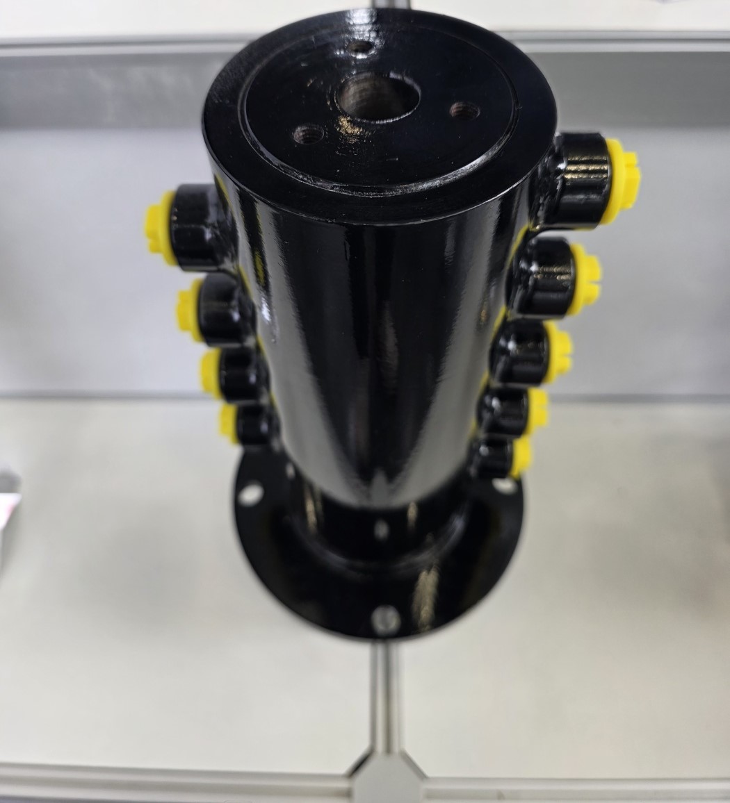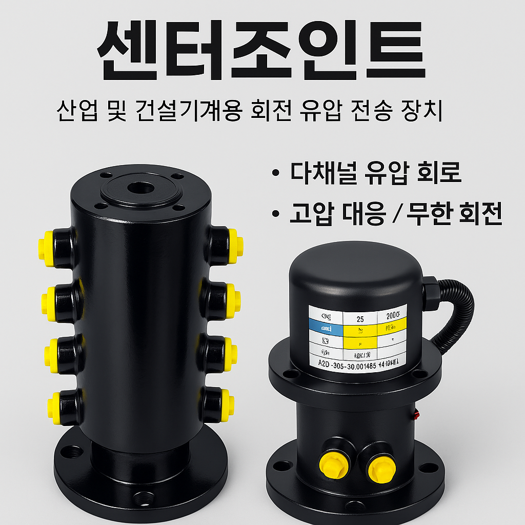 산업 및 건설기계용 회전 유압 전송 장치 1. 제품 개요센터조인트는 상부 회전부와 하부 고정부 사이의 유압 또는 공압 유체를 전달하는 핵심 부품입니다. 회전 중에도 내부 유로를 통해 다수의 유압 회로를 안전하게 연결할 수 있어 굴삭기, 크레인, 틸트로테이터, 스윙 드라이브 등 회전체 구조를 가진 장비에 필수적으로 적용됩니다. 2. 주요 특징