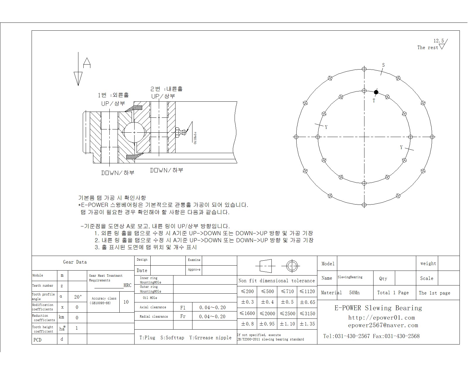 기본품 탭 가공 시 확인사항 *E-POWER 스윙베어링은 기본적으로 관통홀 가공이 되어 있습니다. 탭 가공이 필요한 경우 확인해야 할 사항은 다음과 같습니다. -기준점을 도면상 A로 보고, 내륜 링이 UP/상부 방향입니다. 1. 외륜 링 홀을 탭으로 수정 시 A기준 UP->DOWN 또는 DOWN->UP 방향 및 가공 기장 2. 내륜 링 홀을 탭으로 수정 시 A기준 UP->DOWN 또는 DOWN->UP 방향 및 가공 기장 3. 홀 표시된 도면에 탭 위치 및 개수 표시 확인 후 전달해주시면 빠른 대응이 가능합니다!! 홀 가공만 있는 제품을 어떻게 사용할 지 고민하지 마시고 바로 연락주세요~ T. 031-430-2567 F. 031-430-2568 epower2567@naver.com |